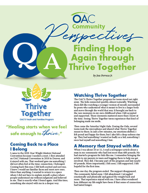Thrive Together is a youth and family program created by the Obesity Action Coalition to support teens and parents affected by weight and health challenges. The program focuses on connection, shared experiences and learning together in a space that feels welcoming and supportive. Families can stay connected beyond events by signing up for the Thrive Together newsletter, which shares stories from the community, helpful resources, upcoming opportunities and ways to stay involved throughout the year. To learn more or sign up, visit ObesityAction.org/thrivetogether.