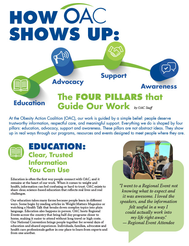 At the Obesity Action Coalition (OAC), our work is guided by a simple belief: people deserve trustworthy information, respectful care, and meaningful support. Everything we do is shaped by four pillars: education, advocacy, support and awareness. These pillars are not abstract ideas. They show up in real ways through our programs, resources and events designed to meet people where they are.