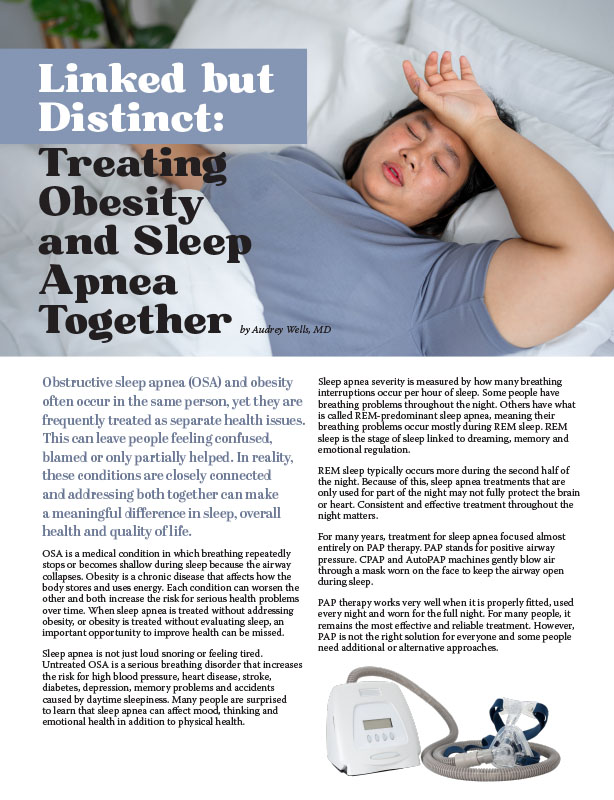 - Individuals who are affected by obesity have a greater chance of suffering from sleep disordered breathing, known as sleep apnea.6 Those with sleep apnea have a greater risk of high blood pressure, irregular heart rhythms and stroke.