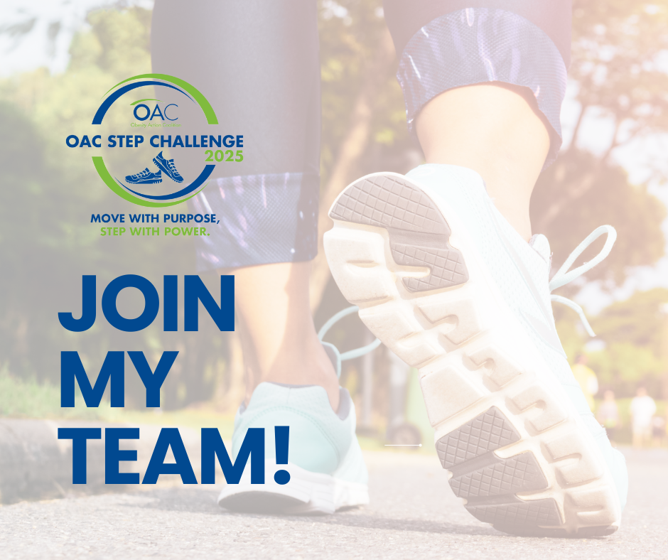 I’m leading a team in the OAC’s 20 Million Step Challenge. Every step we take helps raise awareness, fight weight bias and support people living with obesity. Let’s move with purpose and make an impact together! Join my team today: [team link]